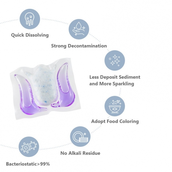 كبسولات غسالة الأطباق قادرة على تنظيف أدوات المائدة الخاصة بنا بفعالية فائقة التنظيف. مع وظائف متعددة لإزالة البقع العنيدة ، وتليين المياه ، ومعدل الجراثيم العالي ، ومنع إعادة الإيداع وجعل أدوات المائدة أكثر تألقًا وما إلى ذلك. كبسولات غسالة الصحون فائقة النقاء مناسبة لغسالات الأطباق الأكثر شيوعًا في السوق.